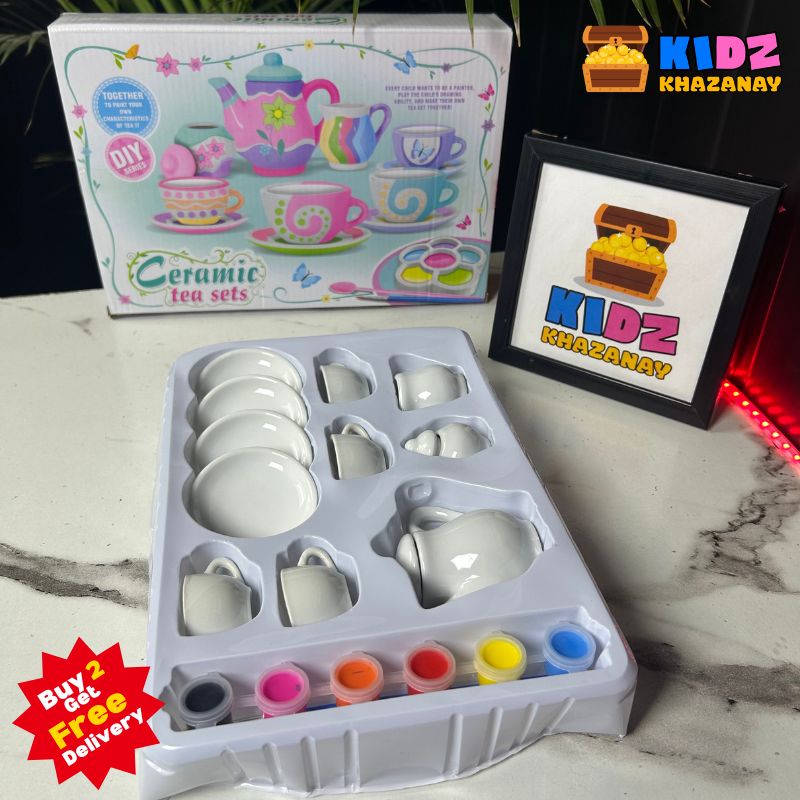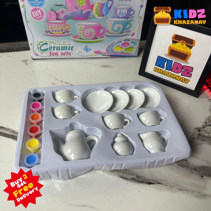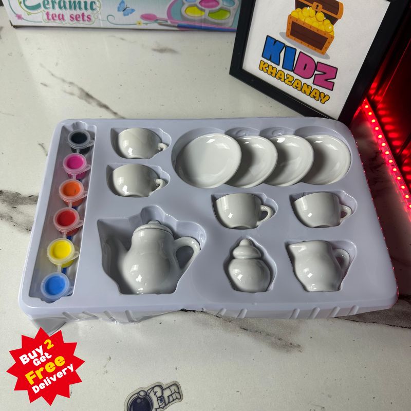Complete DIY Painting Set – Includes ceramic cups, plates, teapot, and containers with paint colors.